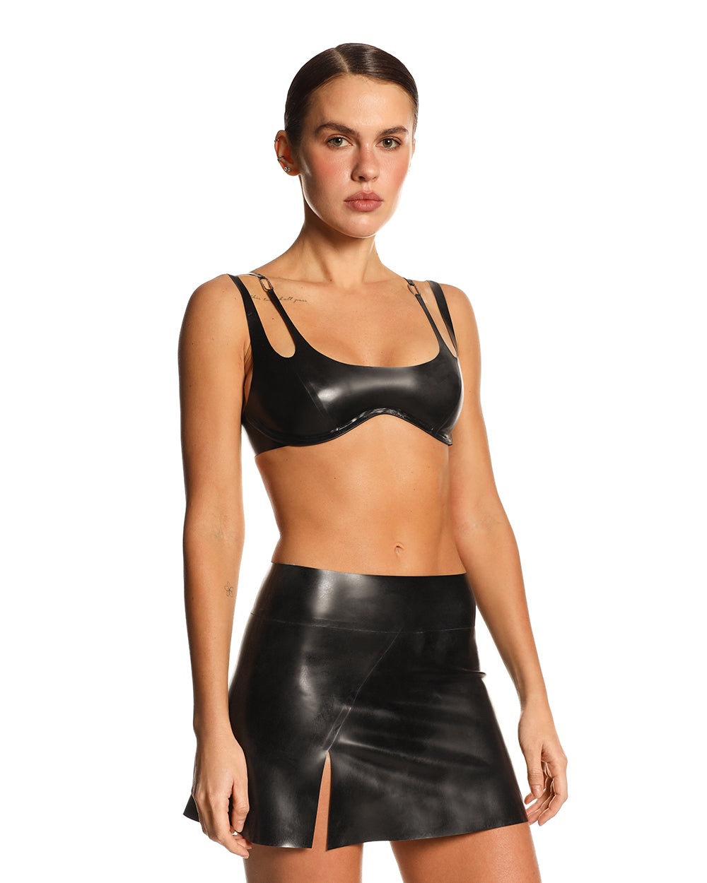 • High-waist latex mini-skirt with a slit. Add the latex belt to highlight the proportions of your silhouette. Style with latex tops or iconic Anoeses corsets.